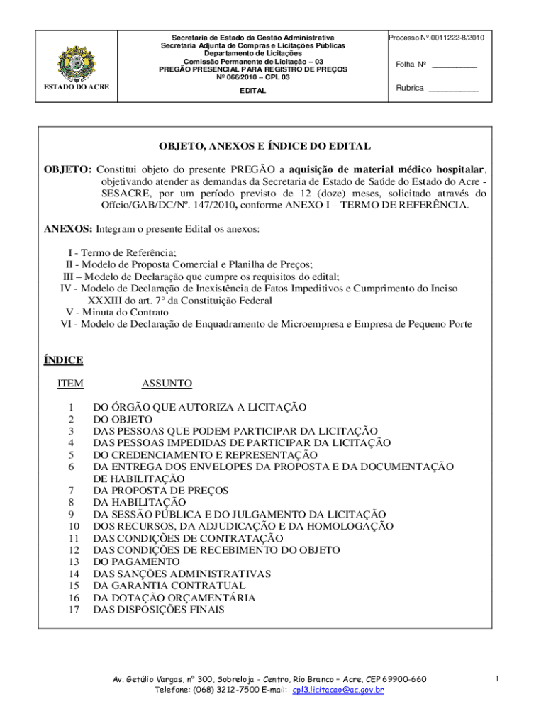 Obtenha o gratuito OBJETO: Constitui objeto do presente PREGO a aquisio de material mdico hospita...