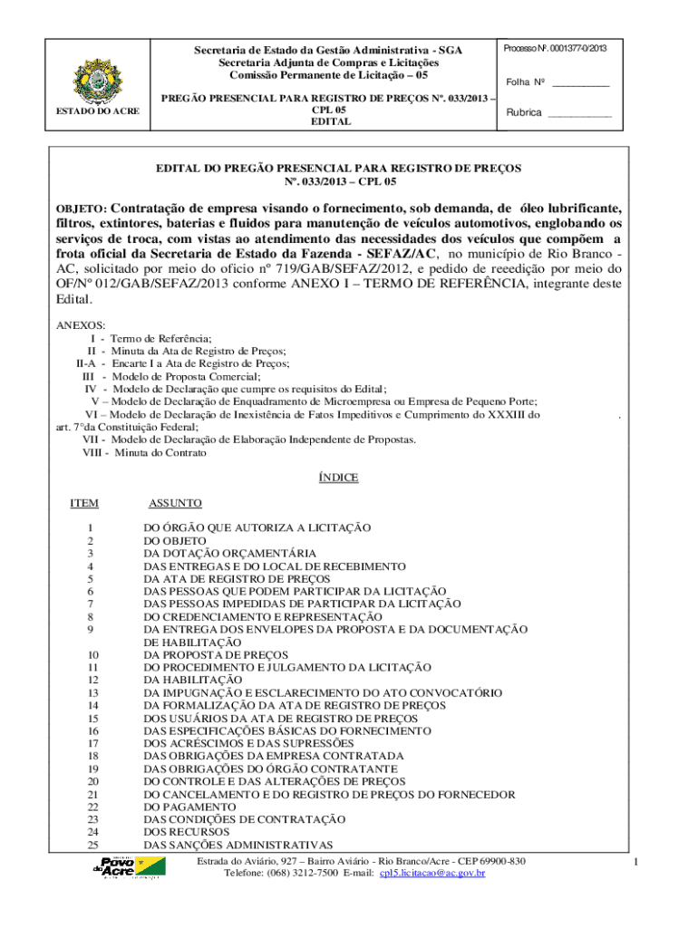 Secretariat de Estado the Gusto Administrative SGA Secretariat Ad junta DE Cameras e Lucites Comics Permanent de Licitao 05 ESTATE DO Reprocess N. 00013770/2013Folha N ___PRESO PRESENCE PARA REGISTRY