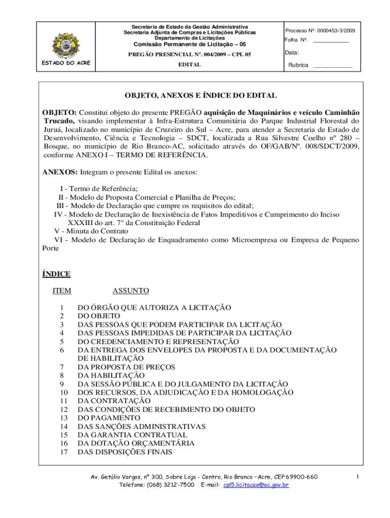 Obtenha o gratuito OBJETO: Constitui objeto do presente PREGO aquisio de Maquinrios e veculo Caminho