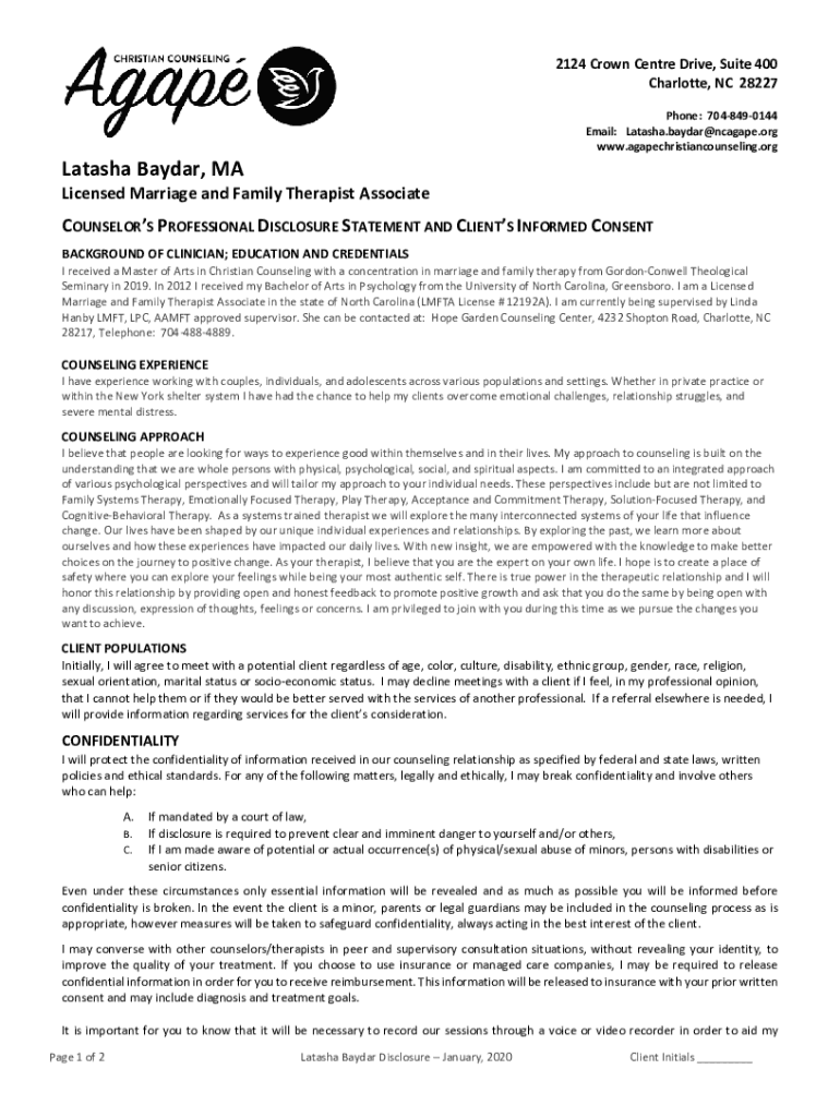 2124 Crown Center Drive, Suite 400 Charlotte, NC 28227 Phone: 7048490144 Email: Latasha.baydar@ncagape.org www.agapechristiancounseling.orgLatasha Radar, MA Licensed Marriage and Family Therapist