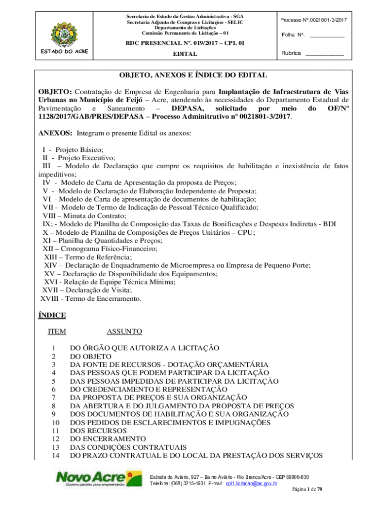 Secretariat de Estado the Gusto Administrative SGA Secretariat Ad junta DE Cameras e Lucites RELIC Department de Licitaes Comics Permanent de Licitao 01Processo N.00218013/2017 Fol ha N.___RDC PRESENCE