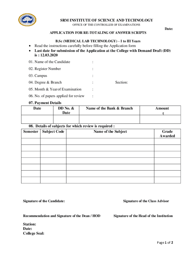 To fill out form-retotalling-bsc-mlt-yr-i-iiipdf, students need to provide their personal information, details of the exam, subject codes, and reasons for requesting re-totalling.