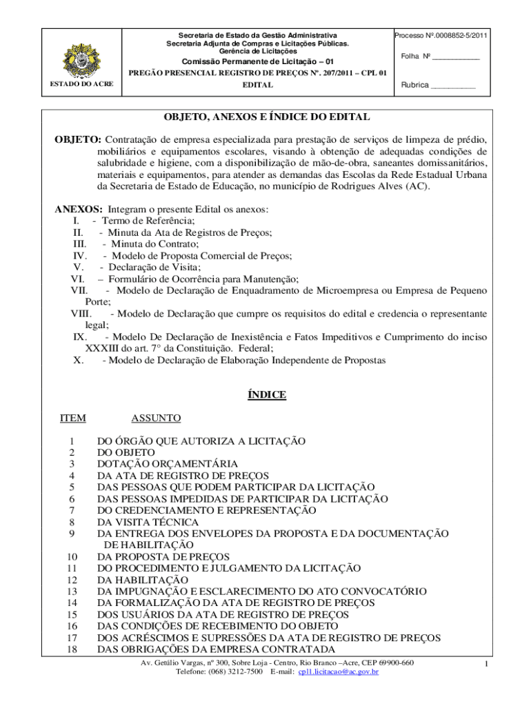 Secretariat de Estado the Gusto Administrative Secretariat Ad junta DE Cameras e Lucites Pelican. Garcia de LicitaesComisso Permanent de Licitao 01Processo N.00088525/2011 Fol ha N ___PRESO PRESENCE