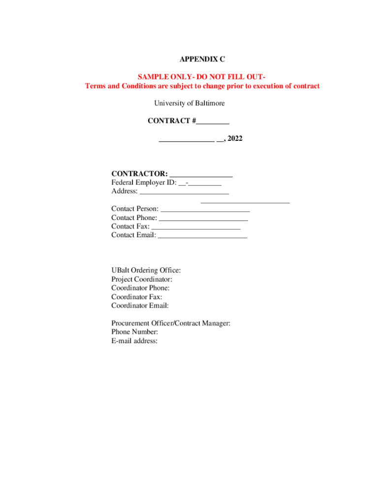 APPENDIX C SAMPLE ONLY DO NOT FILL Cutters and Conditions are subject to change prior to execution of contract University of Baltimore CONTRACT #___ ___ __, 2022CONTRACTOR: ___ Federal Employer ID: