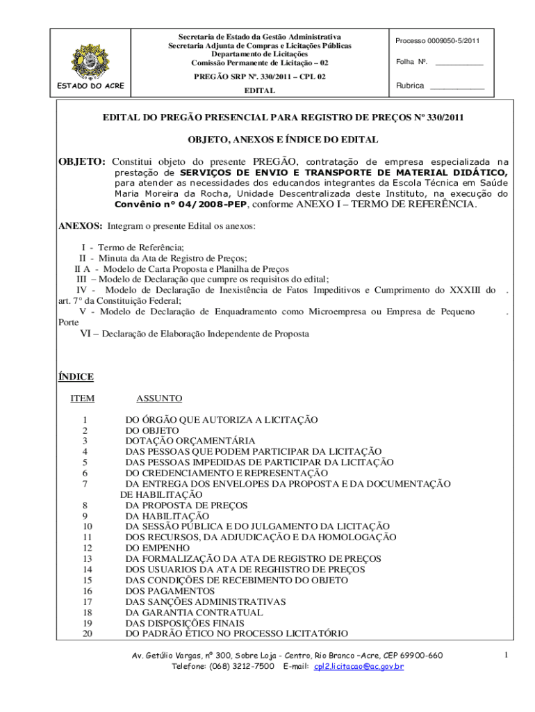 Obtenha o gratuito OBJETO: Constitui objeto do presente PREGO, contratao de empresa especializada na