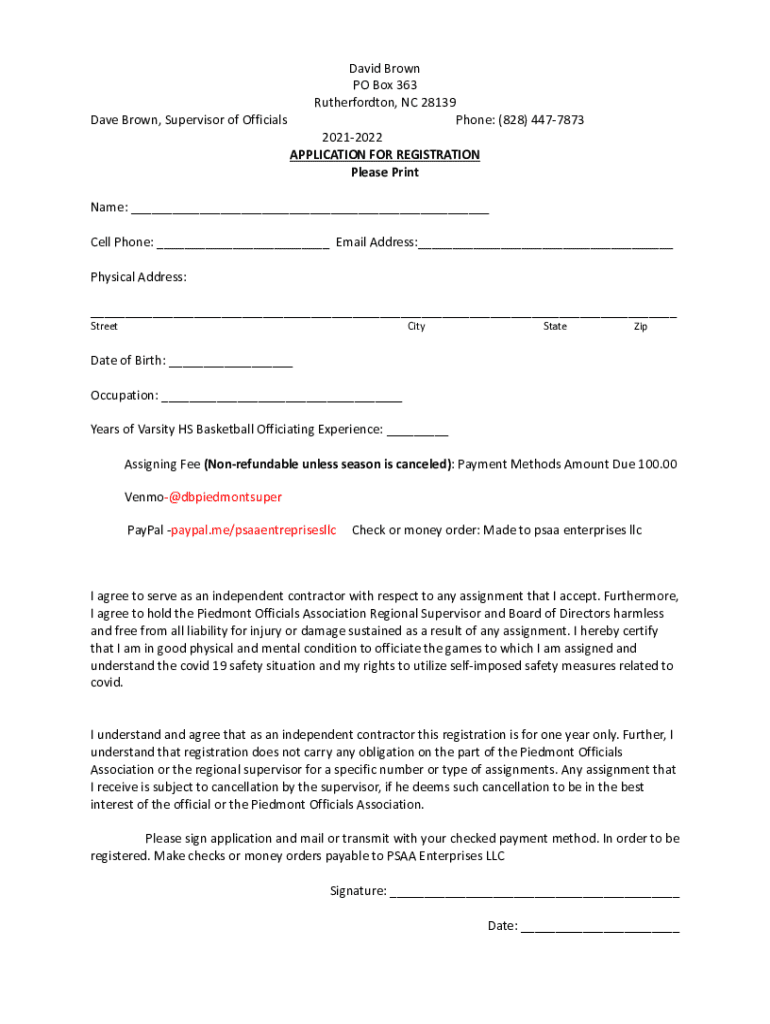 Dave Brown, Supervisor of Officials David Brown PO Box 363 Rutherford ton, NC 28139Phone: (828) 4477873 20212022 APPLICATION FOR REGISTRATION Please Printable: ___ Cell Phone: ___ Email Address:___