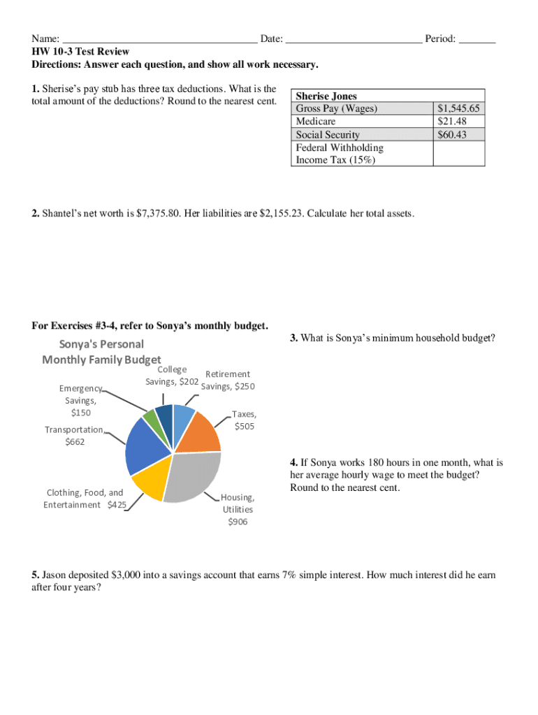 Name: ___ Date: ___ Period: ___ HW 103 Test Review Directions: Answer each question, and show all work necessary. 1. She rises pay stub has three tax deductions. What is the total amount of the deductions?