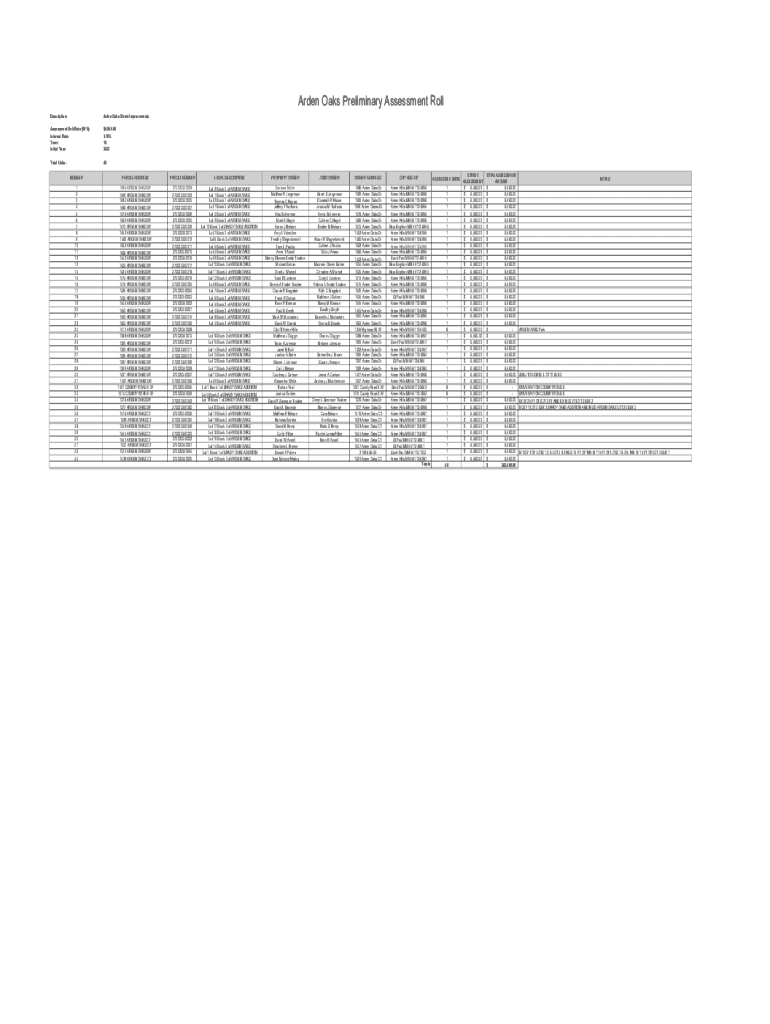 Arden Oaks Preliminary Assessment Roll