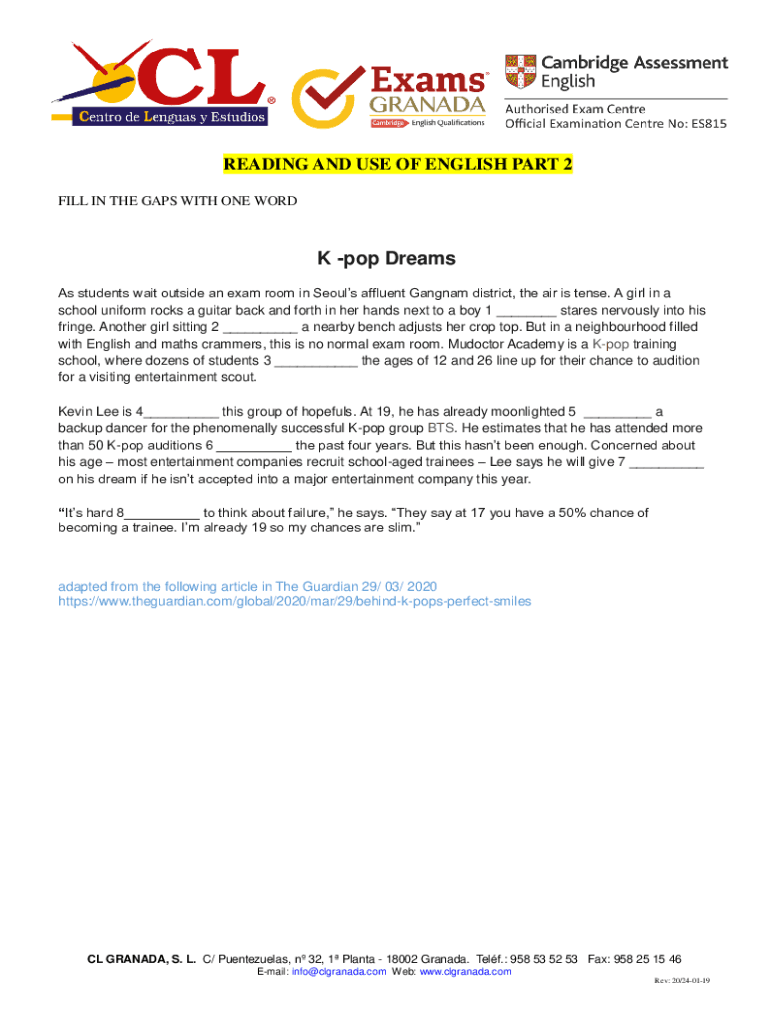 READING AND USE OF ENGLISH PART 2 FILL IN THE GAPS WITH ONE WORK pop Dreams As students wait outside an exam room in Seoul's affluent Annam district, the air is tense. A girl in a school uniform rocks
