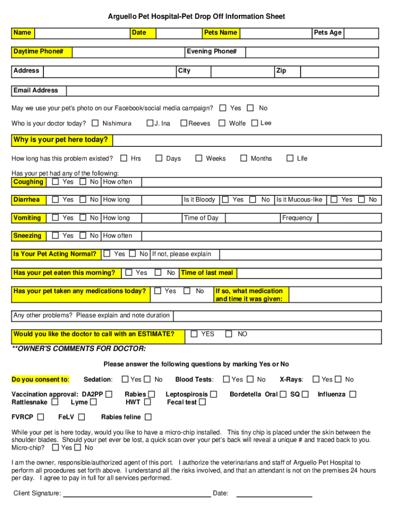Arguello pet hospital-pet drop is a form that pet owners need to fill out when dropping off their pets at the hospital for medical treatment or boarding.