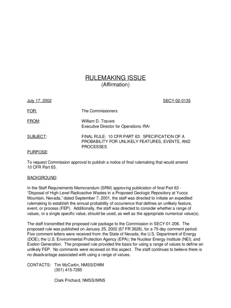 REMAKING ISSUE (Affirmation) July 17, 2002SECY020135FOR:The CommissionersFROM:William D. Travels Executive Director for Operations /RA/SUBJECT:FINAL RULE: 10 CFR PART 63: SPECIFICATION OF A PROBABILITY