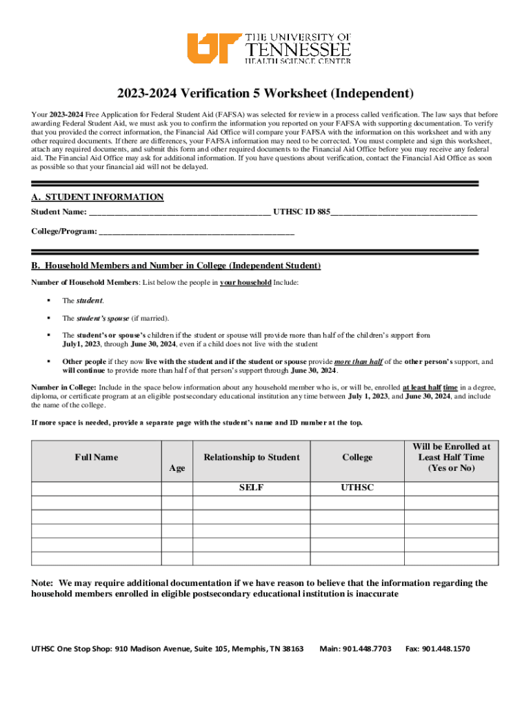 Students applying for financial aid for the 2023-2024 academic year may need to fill out the verification 5 worksheet as part of the verification process.