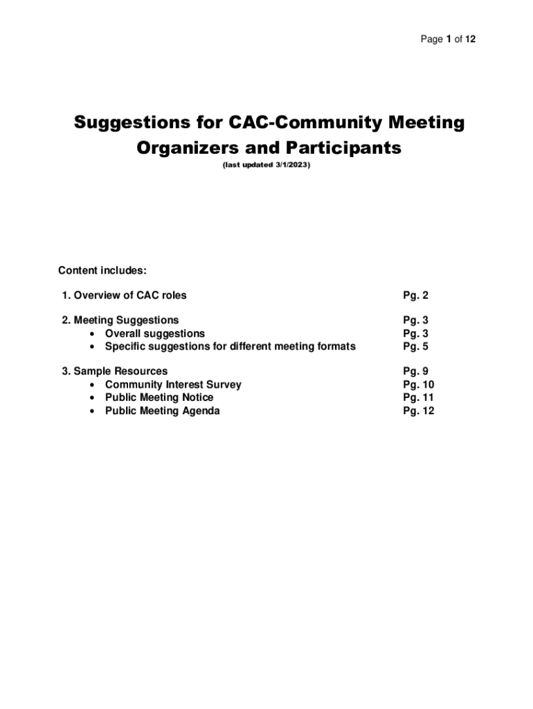 Page 1 of 12Suggestions for Community Meeting Organizers and Participants (last updated 3/1/2023)Content includes: 1. Overview of CAC roles. 22. Meeting Suggestions Overall suggestions Specific suggestions