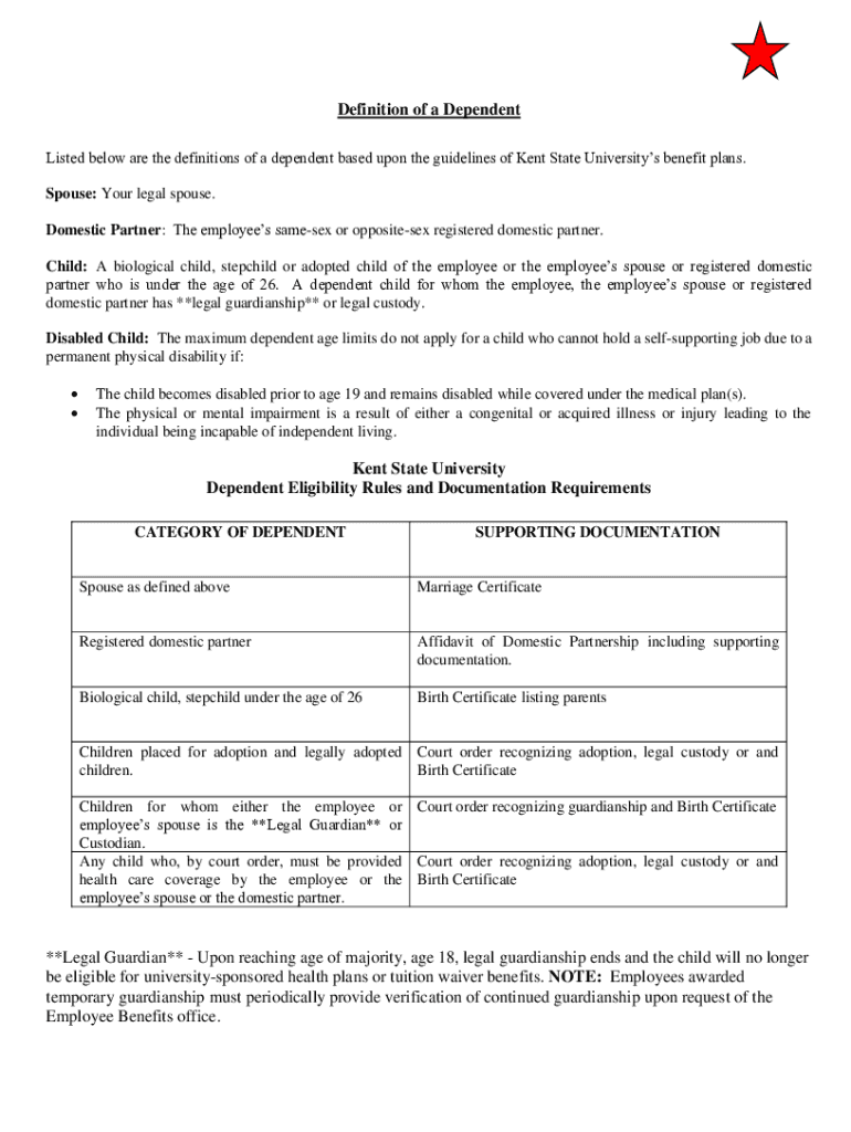 Definition of a Dependent Listed below are the definitions of a dependent based upon the guidelines of Kent State Universities benefit plans. Spouse: Your legal spouse. Domestic Partner: The employees