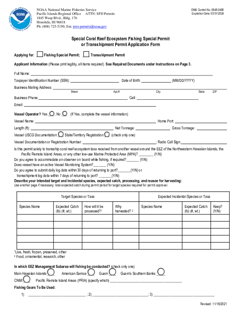 OMB Control No. 06480490 Expiration Date: 03/31/2024NOAA National Marine Fisheries Service Pacific Islands Regional Office ATTN: SD Permits 1845 Wasp Blvd., Bldg. 176 Honolulu, HI 96818 pH: (808)