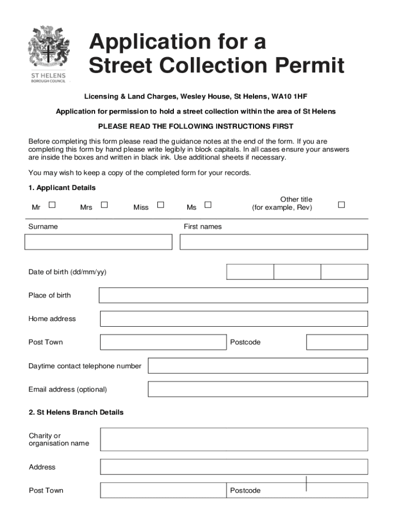 Application for a Street Collection Permit Licensing & Land Charges, Wesley House, St Helen's, WA10 1HF Application for permission to hold a street collection within the area of St Helen's PLEASE