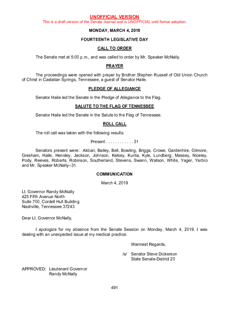 UNOFFICIAL VERSION This is a draft version of the Senate Journal and is UNOFFICIAL until formal adoption. MONDAY, MARCH 4, 2019, FOURTEENTH LEGISLATIVE DAY CALL TO ORDER The Senate met at 5:00 p.m.,