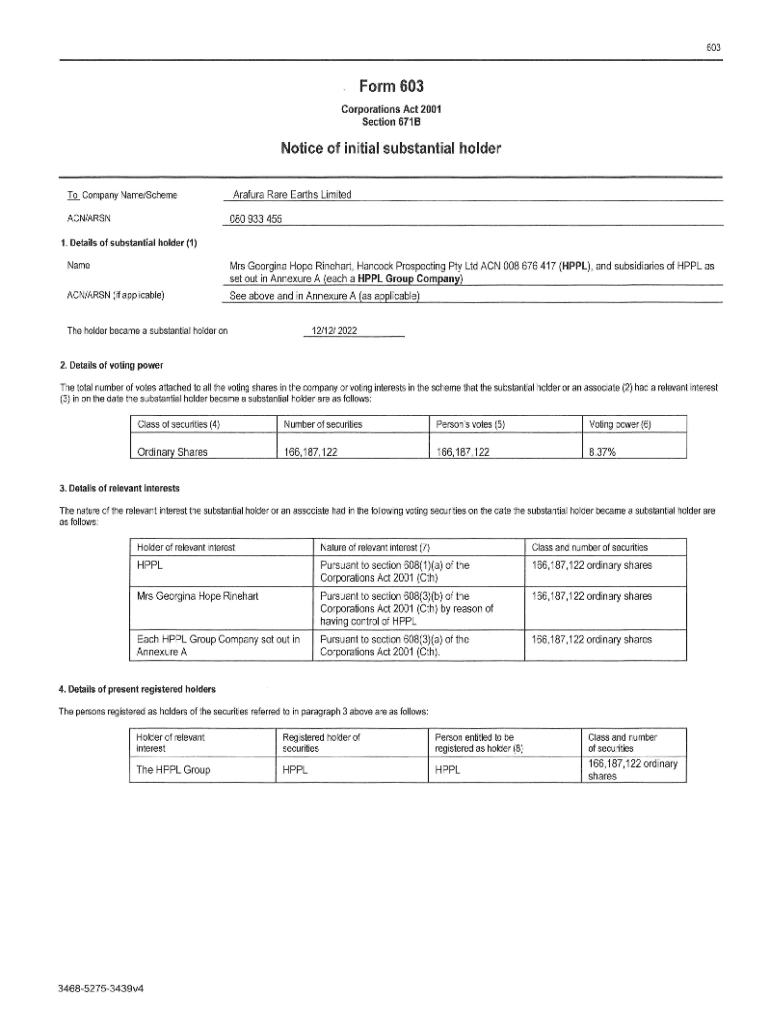 603Form 603 Corporations Act 2001, Section 671 Notice of initial substantial holder To Company Name/Scheme ACN/ARSNArafura Rare Earths Limited 080 933 4551. Details of substantial holder (1) Name