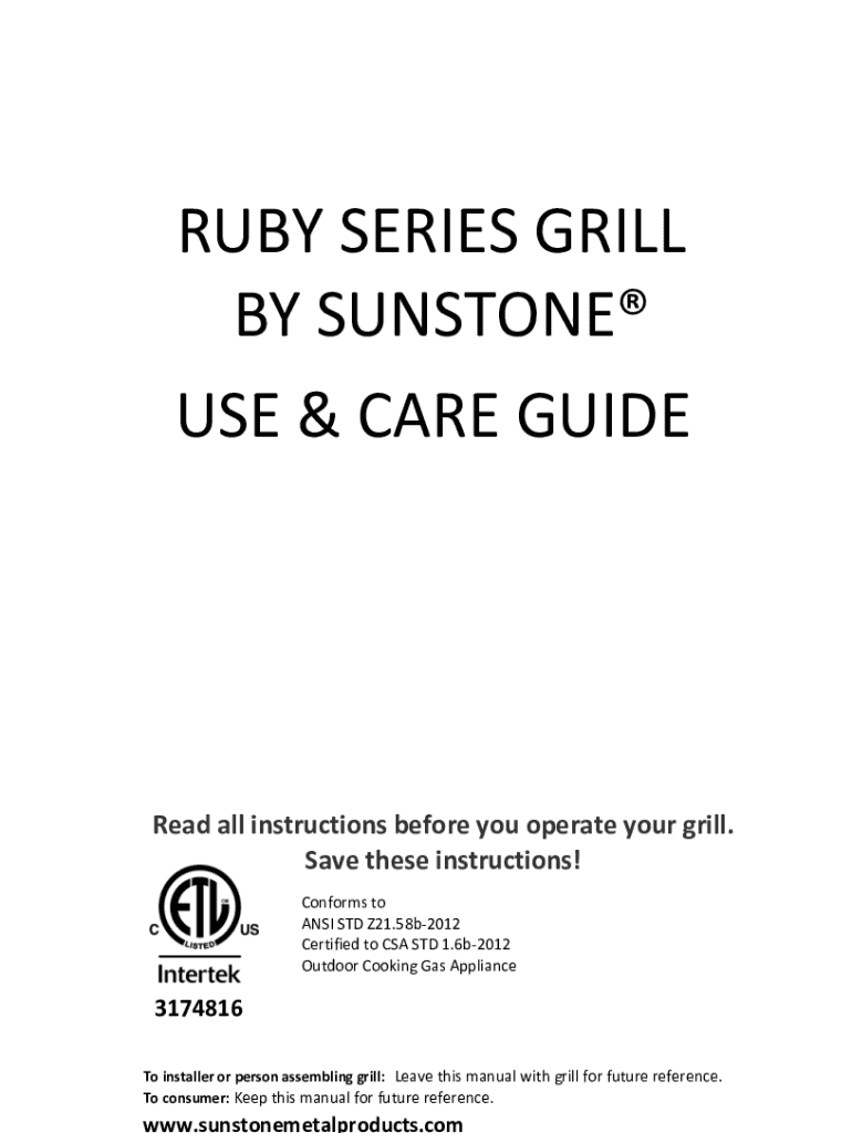 RUBY SERIES GRILL BY SANDSTONE USE & CARE Guided all instructions before you operate your grill. Save these instructions! Conforms to ANSI STD Z21.58b2012 Certified to CSA STD 1.6b2012 Outdoor Cooking