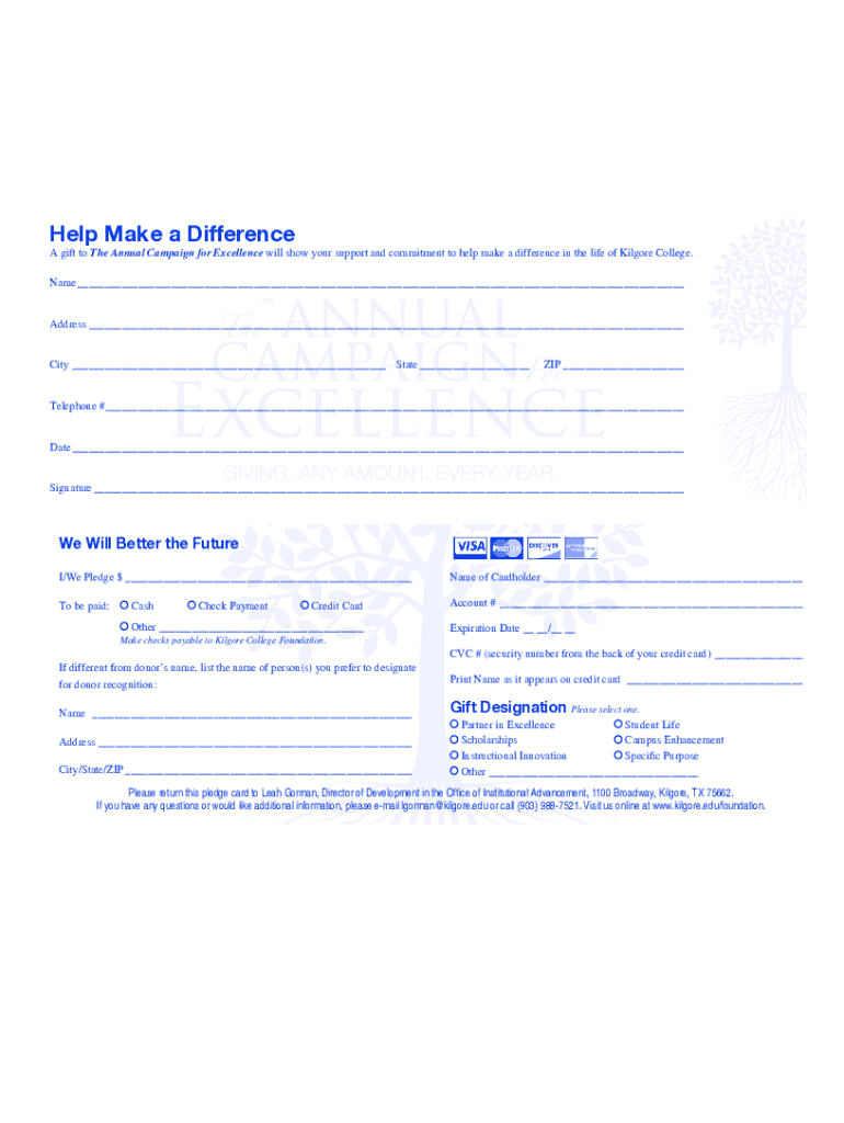 Help Make a Difference gift to The Annual Campaign for Excellence will show your support and commitment to help make a difference in the life of Kilgore College. Name___ Address___ City___ State___ZIP___