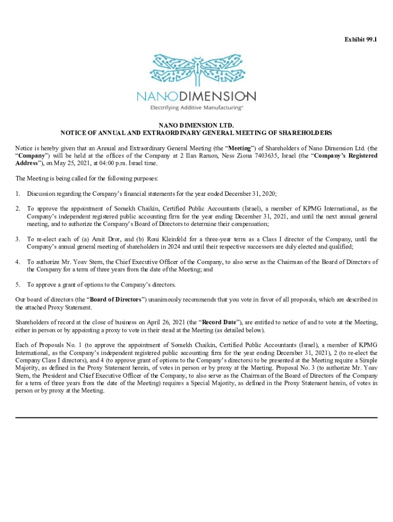 Exhibit 99.1NANO DIMENSION LTD. NOTICE OF ANNUAL AND EXTRAORDINARY GENERAL MEETING OF SHAREHOLDERS Notice is hereby given that an Annual and Extraordinary General Meeting (the Meeting) of Shareholders