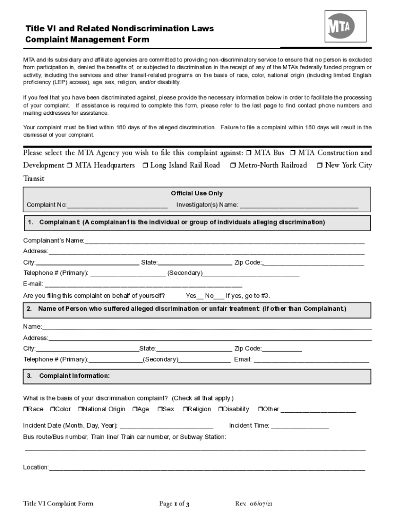 Title VI and Related Nondiscrimination Laws Complaint Management Form MTA and its subsidiary and affiliate agencies are committed to providing nondiscriminatory service to ensure that no person is