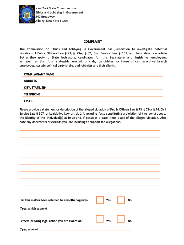 New York State Commission on Ethics and Lobbying in Government 540 Broadway Albany, New York 12207COMPLAINT The Commission on Ethics and Lobbying in Government has jurisdiction to investigate potential