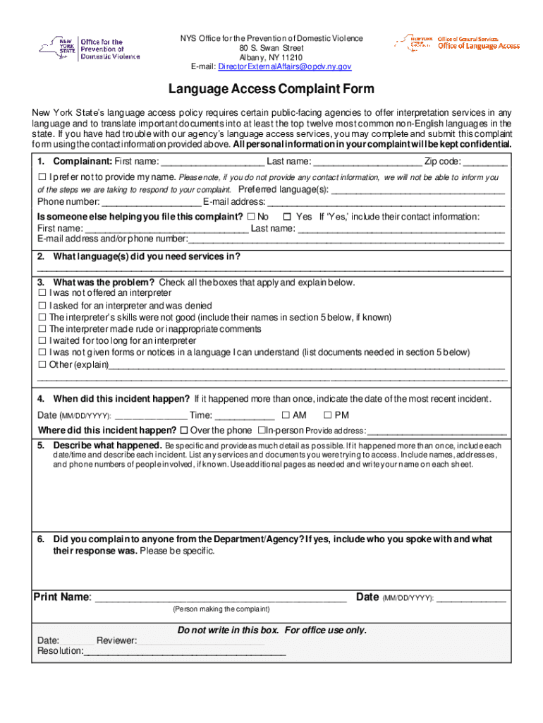 NYS Office for the Prevention of Domestic Violence 80 S. Swan Street Albany, NY 11210 Email: DirectorExternalAffairs@opdv.ny.govLanguage Access Complaint Form New York States language access policy