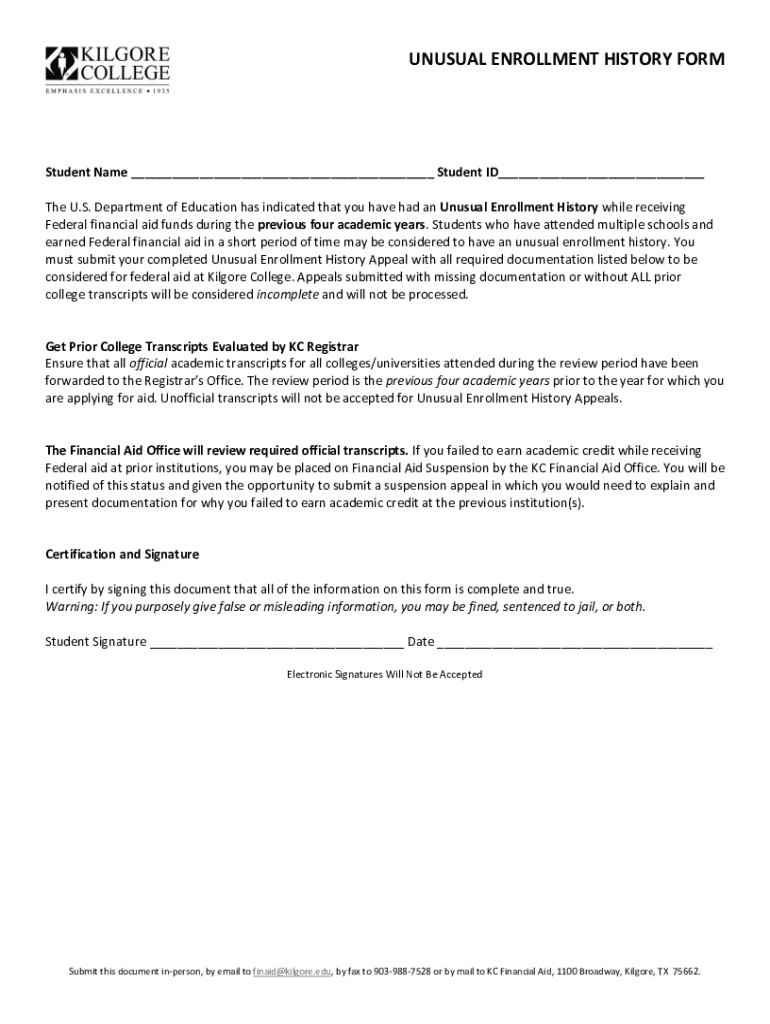 UNUSUAL ENROLLMENT HISTORY FORMStudent Name ___ Student ID___ The U.S. Department of Education has indicated that you have had an Unusual Enrollment History while receiving Federal financial aid funds