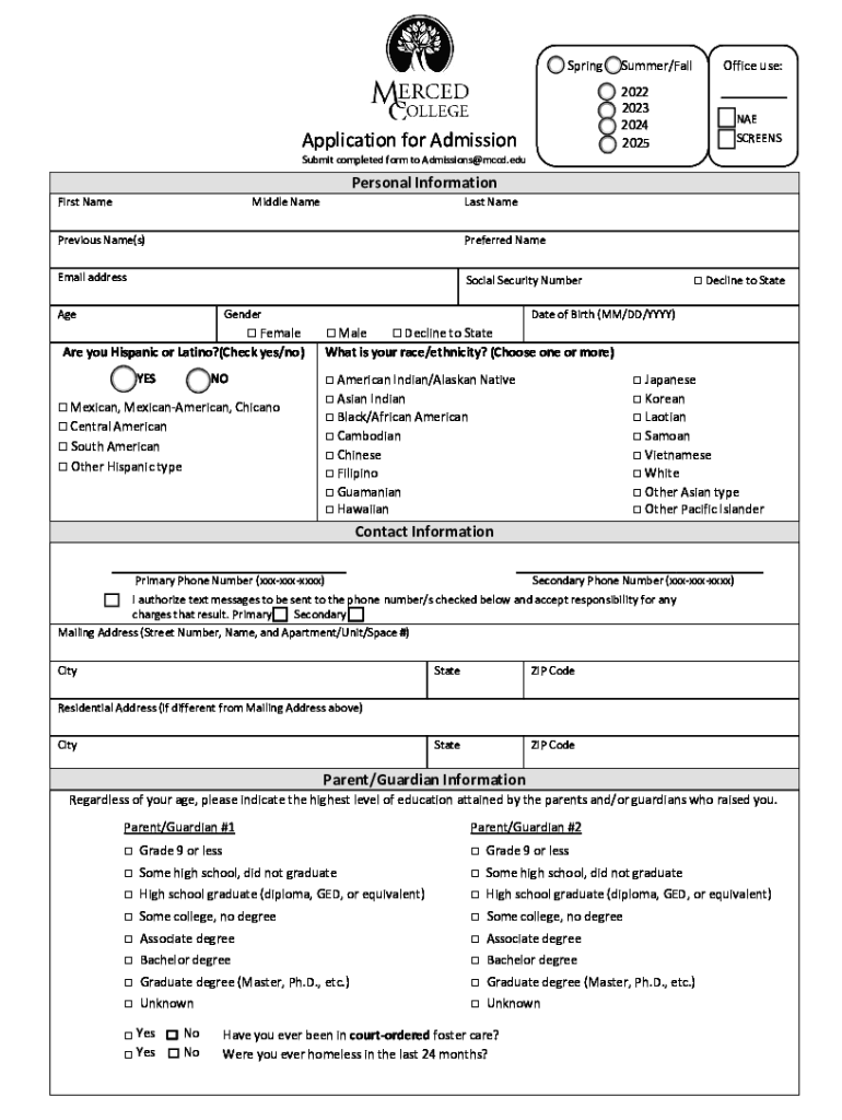 SCREENSSubmit completed form to Admissions@mccd.eduFirst Impersonal InformationMiddle Nameless NamePrevious Name(s)Preferred