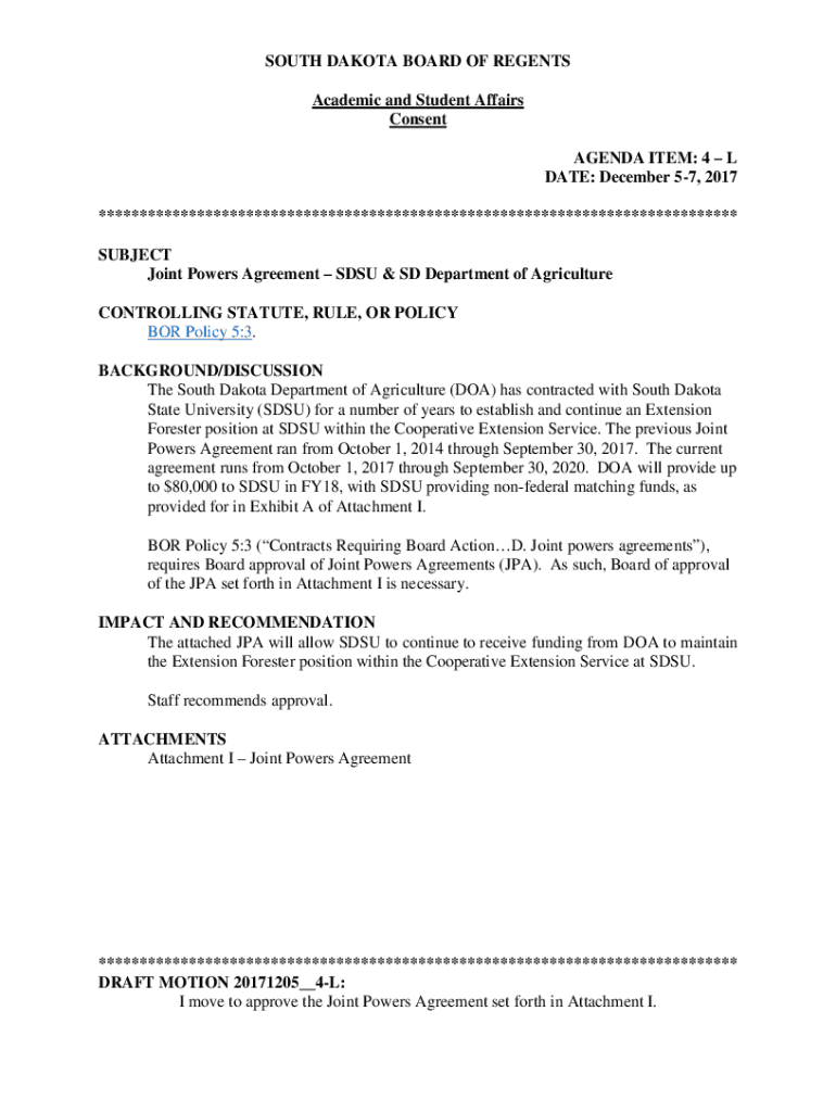 SOUTH DAKOTA BOARD OF REGENTS Academic and Student Affairs Consent AGENDA ITEM: 4 L DATE: December 57, 2017 ****************************************************************************** SUBJECT Joint