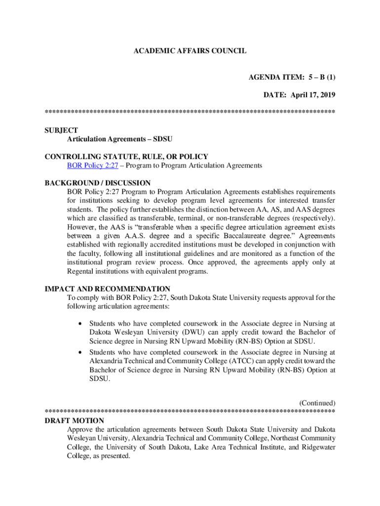 ACADEMIC AFFAIRS COUNCIL AGENDA ITEM: 5 B (1) DATE: April 17, 2019 ****************************************************************************** SUBJECT Articulation Agreements SDSU CONTROLLING STATUTE,
