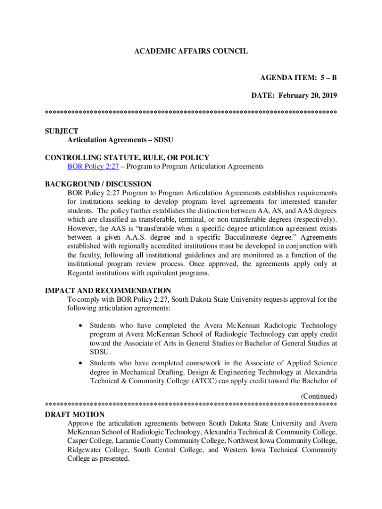 ACADEMIC AFFAIRS COUNCIL AGENDA ITEM: 5 B DATE: February 20, 2019 ****************************************************************************** SUBJECT Articulation Agreements SDSU CONTROLLING STATUTE,