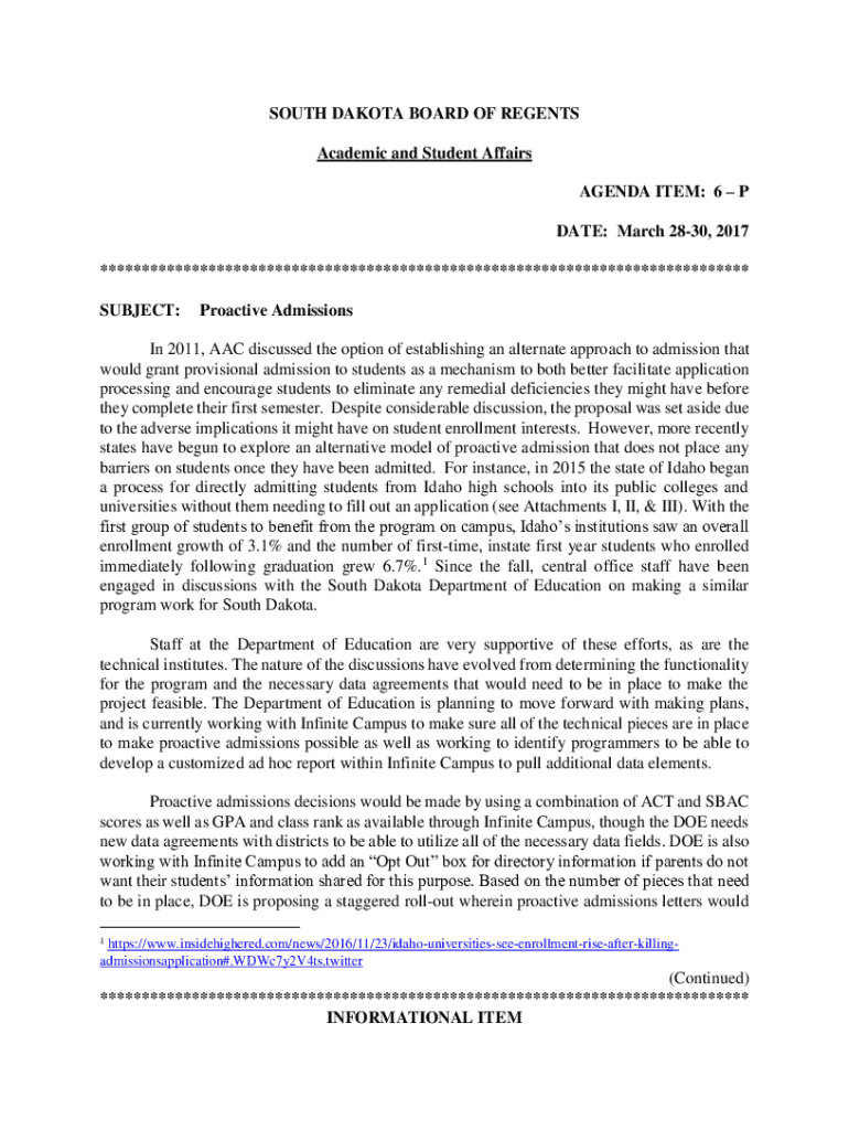 SOUTH DAKOTA BOARD OF REGENTS Academic and Student Affairs AGENDA ITEM: 6 P DATE: March 2830, 2017 ****************************************************************************** SUBJECT:Proactive