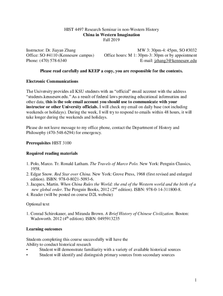 HIST 4497 Research Seminar in nonWestern History China in Western Imagination Fall 2019 Instructor: Dr. Japan Zhang Office: SO #4110 (Kennesaw campus) Phone: (470) 5786340MW 3: 30pm4: 45pm, SO #3032