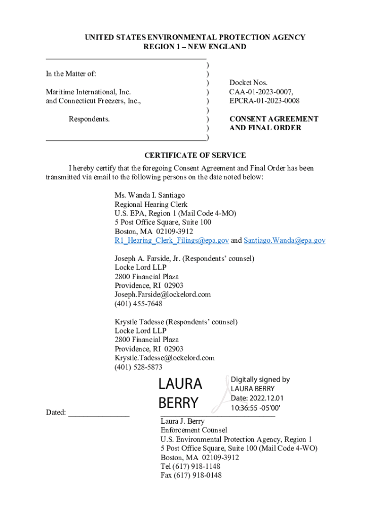 UNITED STATES ENVIRONMENTAL PROTECTION AGENCY REGION 1 NEW ENGLAND In the Matter of: Maritime International, Inc. and Connecticut Freezers, Inc., Respondents.) ))))))))Docket Nos. CAA0120230007, EPCRA0120230008