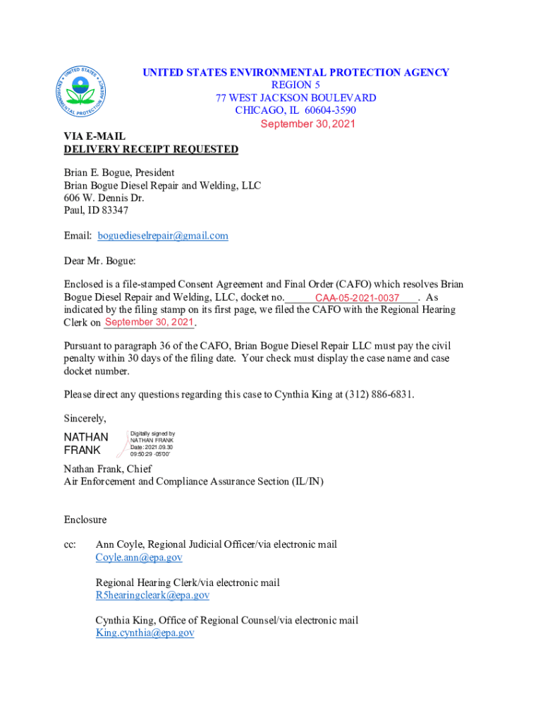UNITED STATES ENVIRONMENTAL PROTECTION AGENCY REGION 5 77 WEST JACKSON BOULEVARD CHICAGO, IL 606043590 September 30, 2021VIA EMAIL DELIVERY RECEIPT REQUESTED Brian E. Rogue, President Brian Rogue