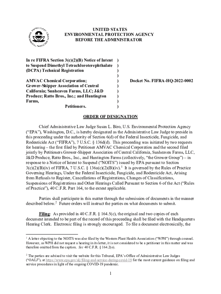 UNITED STATES ENVIRONMENTAL PROTECTION AGENCY BEFORE THE ADMINISTRATOR In re FIFA Section 3(c)(2)(B) Notice of Intent) to Suspend Dimethyl Tetrachloroterephthalate) (CPA) Technical Registration))
