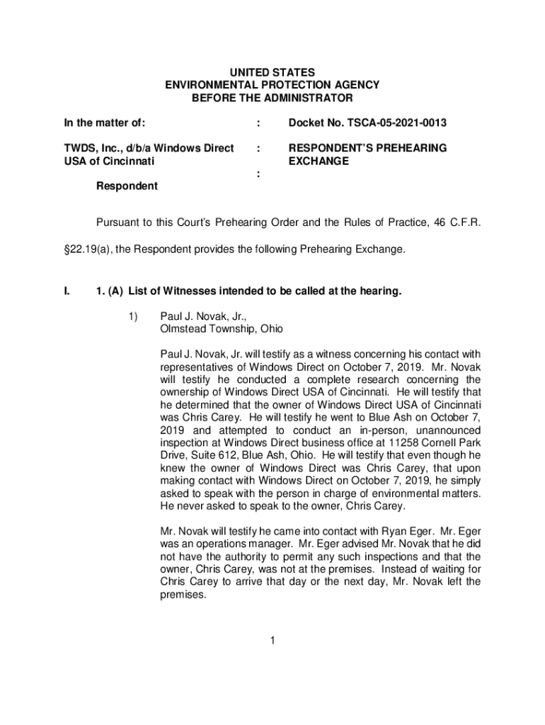 UNITED STATES ENVIRONMENTAL PROTECTION AGENCY BEFORE THE ADMINISTRATOR In the matter of::Docket No. TSCA0520210013TWDS, Inc., d/b/a Windows Direct USA of Cincinnati:RESPONDENTS REHEARING EXCHANGE: