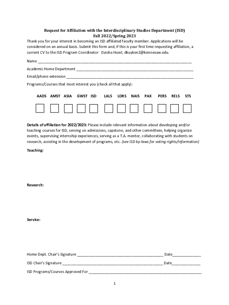 Request for Affiliation with the Interdisciplinary Studies Department (ISD) Fall 2022/Spring 2023 Thank you for your interest in becoming an ISD affiliated faculty member. Applications will be considered