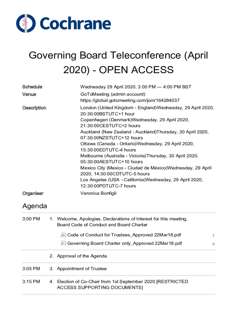 Governing Board Teleconference (April 2020) OPEN ACCESS Schedule Wednesday 29 April 2020, 3:00 PM 4:00 PM BSTVenueGoToMeeting (admin account): https://global.gotomeeting.com/join/164284037DescriptionLondon