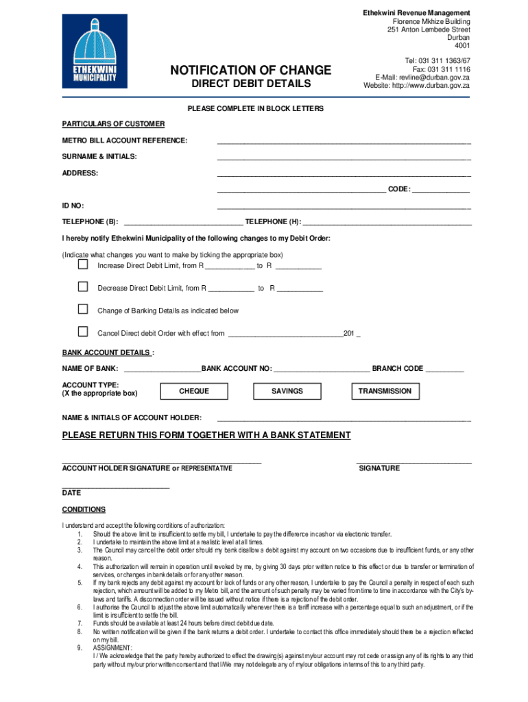 Ethekwini Revenue Management Florence Maize Building 251 Anton Embed Street Durban 4001 Tel: 031 311 1363/67 Fax: 031 311 1116 Email: revline@durban.gov.za Website: http://www.durban.gov.zaNOTIFICATION