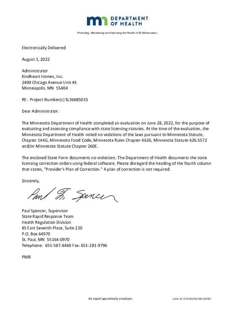 Protecting, Maintaining and Improving the Health of All MinnesotansElectronically Delivered August 1, 2022, Administrator Kind heart Homes, Inc. 2400 Chicago Avenue Unit #1 Minneapolis, MN 55404 RE:
