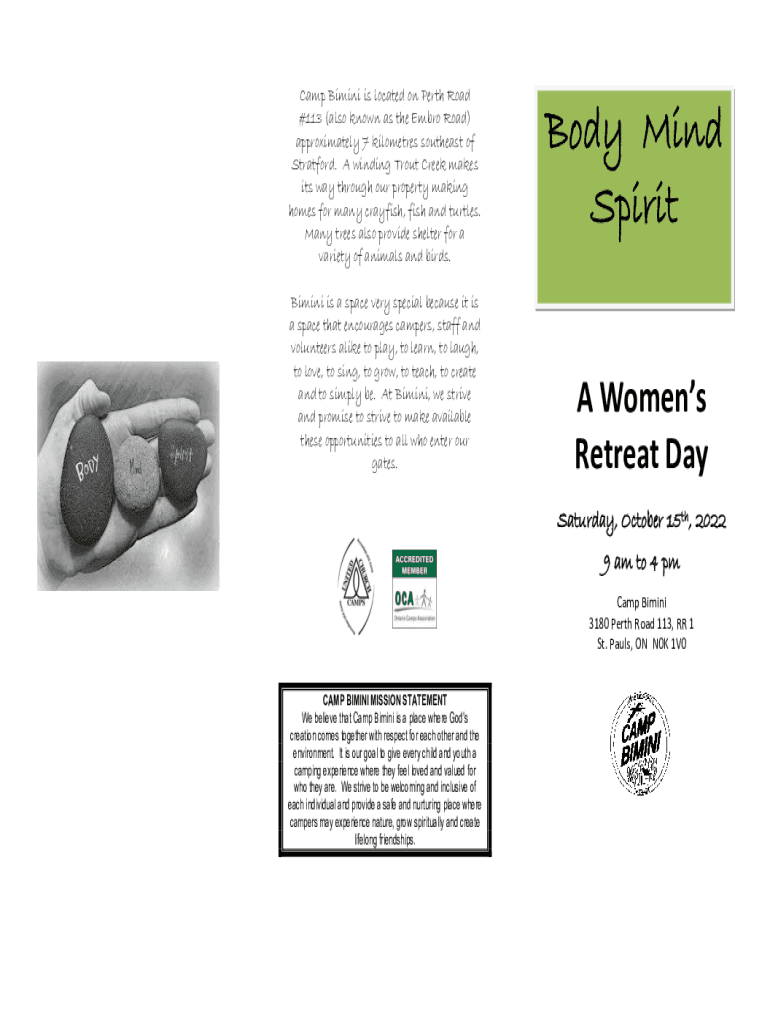Camp Bimini is located on Perth Road #113 (also known as the Embryo Road) approximately 7 kilometers southeast of Stratford. A winding Trout Creek makes its way through our property making homes for