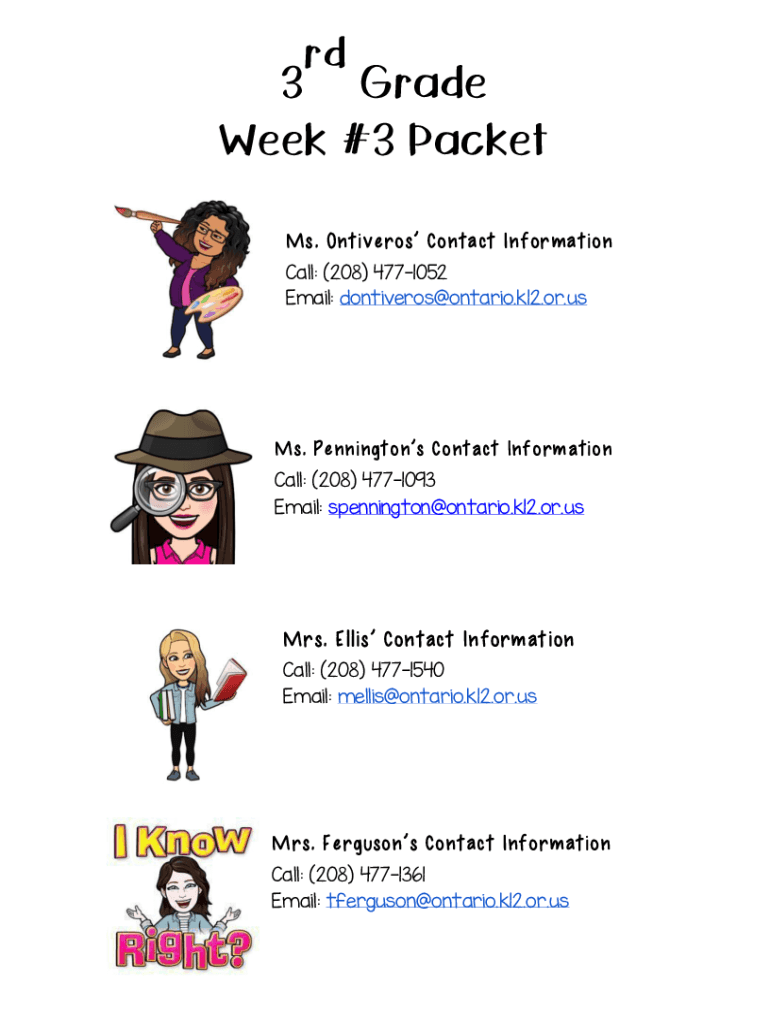 Rd3 Grade Week #3 Packet Ms. Antihero Contact Information Call: (208) 4771052 Email: dontiveros@ontario.k12.or.usMs. Pennington's Contact Information Call: (208) 4771093 Email: spennington@ontario.k12.or.usMrs.
