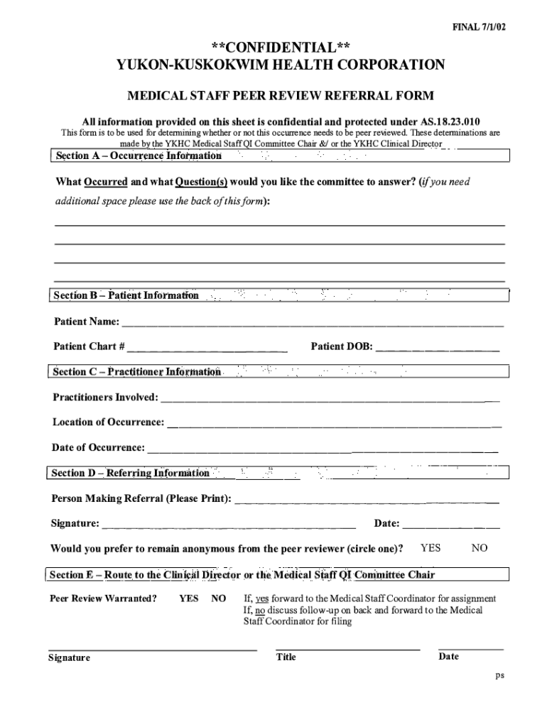 FINAL 7/1/02**CONFIDENTIAL** YUKONKUSKOKWIM HEALTH CORPORATION MEDICAL STAFF PEER REVIEW REFERRAL From All information provided on this sheet is confidential and protected under AS.18.23.010This form