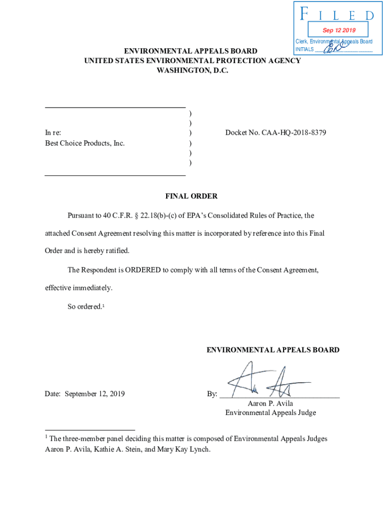FI L E D Sep 12 2019Clerk, Environmental Appeals BoardINITIALS ___ ENVIRONMENTAL APPEALS BOARD UNITED STATES ENVIRONMENTAL PROTECTION AGENCY WASHINGTON, D.C. In re: Best Choice Products, Inc.) )))))Docket