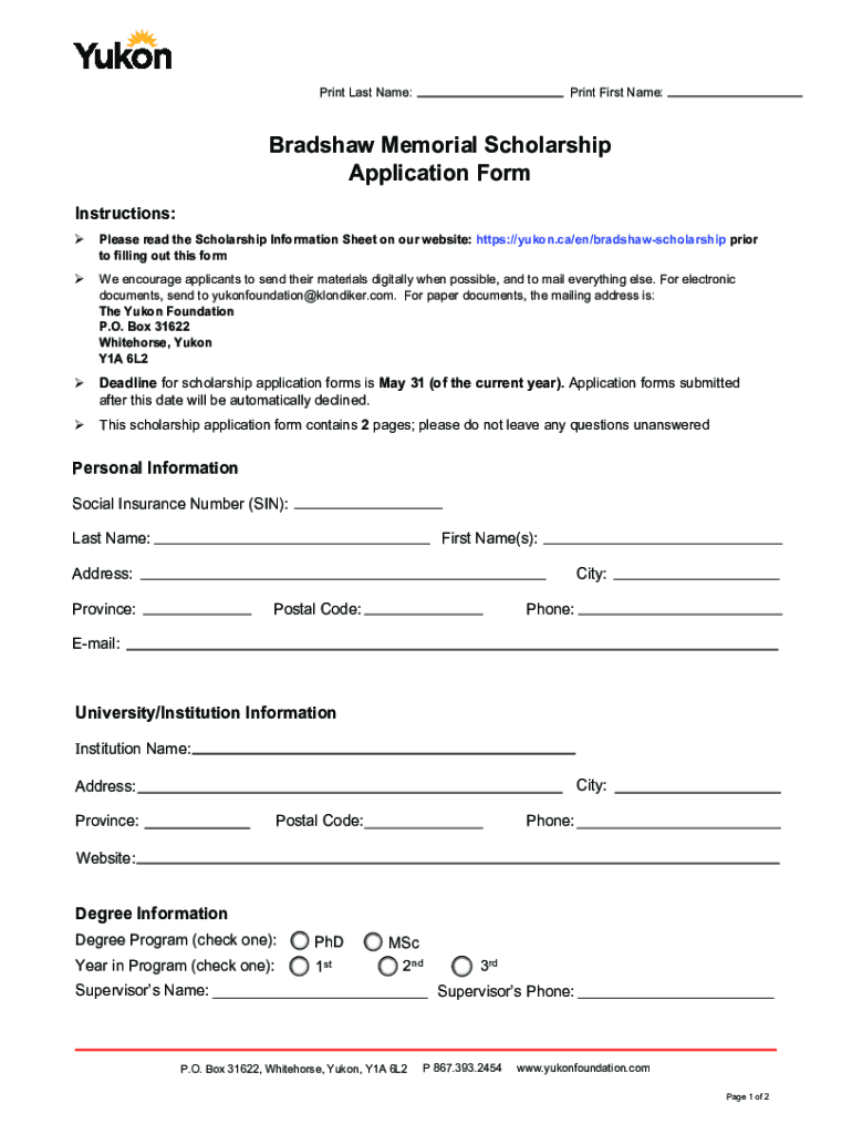 Print Last Name:Print First Name:Bradshaw Memorial Scholarship Application Form Instructions: Please read the Scholarship Information Sheet on our website: https://yukon.ca/en/bradshawscholarship