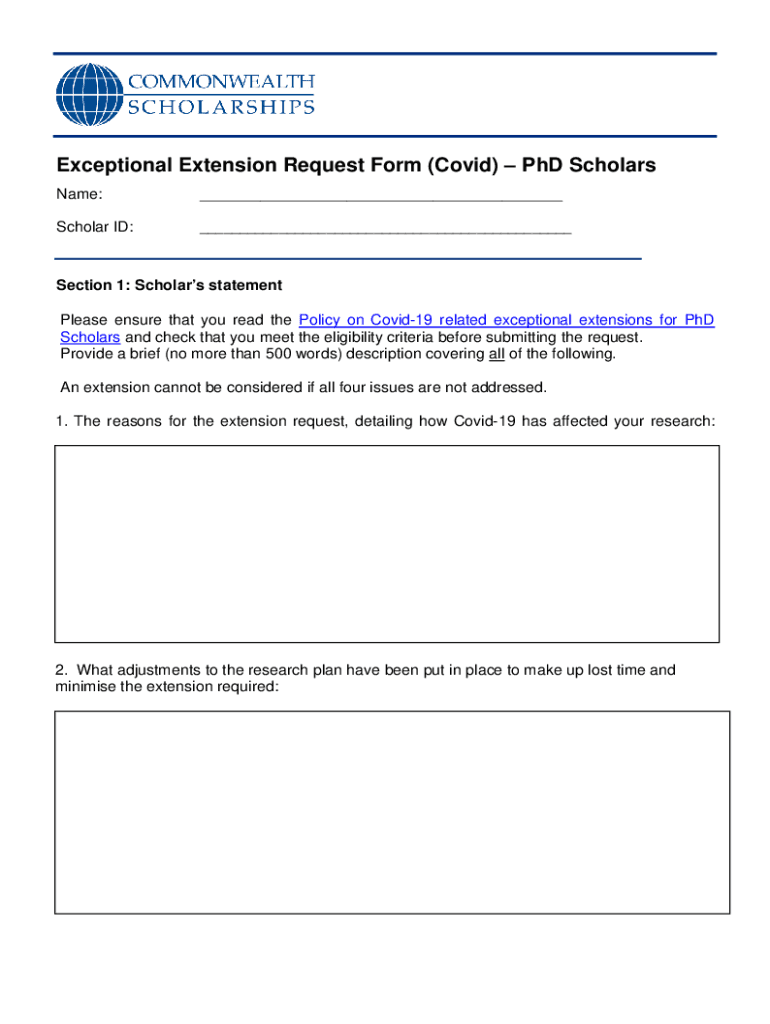 Exceptional Extension Request Form (COVID-19) PhD Scholars Name:___Scholar ID:___Section 1: Scholars statement Please ensure that you read the Policy on COVID-19 related exceptional extensions for