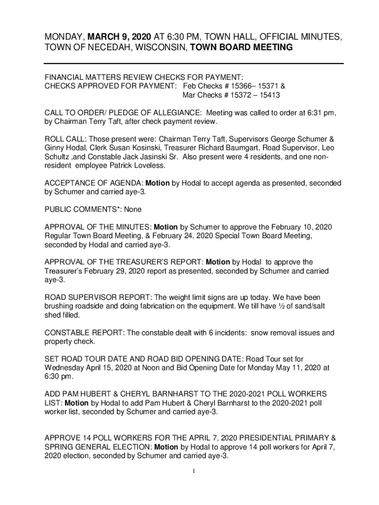 MONDAY, MARCH 9, 2020, AT 6:30 PM, TOWN HALL, OFFICIAL MINUTES, TOWN OF NEED, WISCONSIN, TOWN BOARD MEETING FINANCIAL MATTERS REVIEW CHECKS FOR PAYMENT: CHECKS APPROVED FOR PAYMENT: Feb Checks # 15366